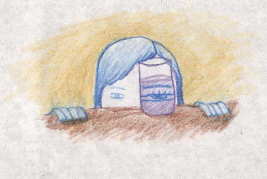 玻璃杯后面的小蓝的眼睛。 。